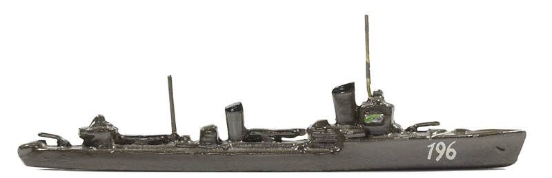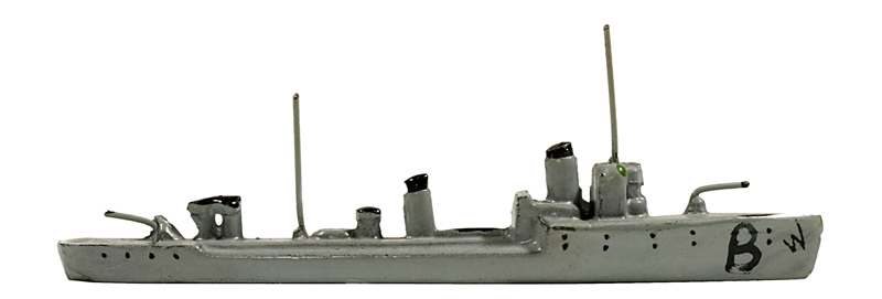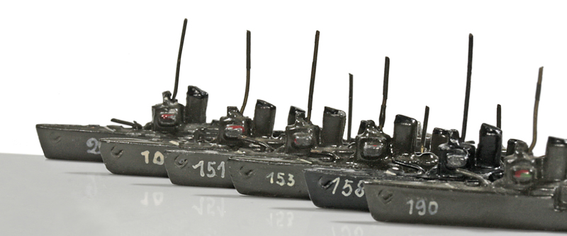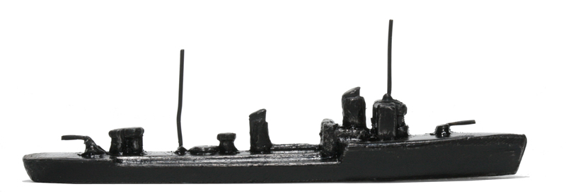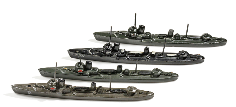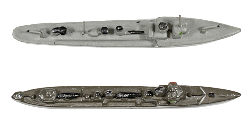 | 1936 | VG, schwarz. Hinter dem hinteren Schornstein jetzt ein zweiter Torpedorohrsatz. Der vordere Satz jetzt auch freistehend. Anker mitgegossen, Drahtrohrgeschütze. Torpedosätze und Leitstände hell hervorgehoben. Der Wellenabweiser ist überwiegend farbig hervorgehoben. Kennung meistens hds. Möglichkeiten wie oben. Die Form ist im Vergleich zur Vorgängerversion schlanker geworden. 1935/36 wurde das Modell auch als "Minensuchbootführer" angeboten. Nach der Ausmusterung als Torpedoboote wurden die Schiffe in vielen anderen Postionen eingesetzt, auch als Minensucher. | |