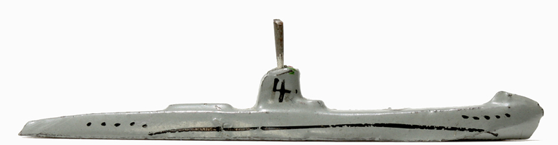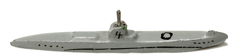 1938 - 1941 | Der wesentlichen Formunterschied, neben den geänderten Erhebungen, ist Haevecker entgangen: Das erste Modell ohne gegossene Tauchtanks, wie in der zweiten Auflage vorhanden. VG, Metall, grau bis sandgrau. Steilere Netzsäge als vorher. An Heck und Bug je 3 oder 4 Flutschlitze. Je eine gegossene Erhebung, in der Höhe unterschiedlich, vor und hinter dem Turm. Auf dem Achterdeck 1 Telefonboje rot oder schwarz. 1 Drahtperiskop. Kennung hds 1 - 24 und 56 - 63. Es kommen Modelle ohne jegliche Kennung und mit Kennung "27", obwohl nicht der Realität entsprechend, vor. Die bei H. genannte bemalte Kunststoffversion scheint es von Wiking nicht wirklich gegeben zu haben.