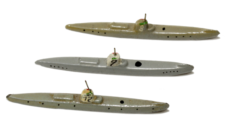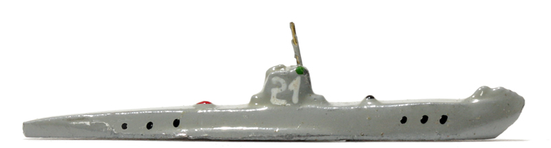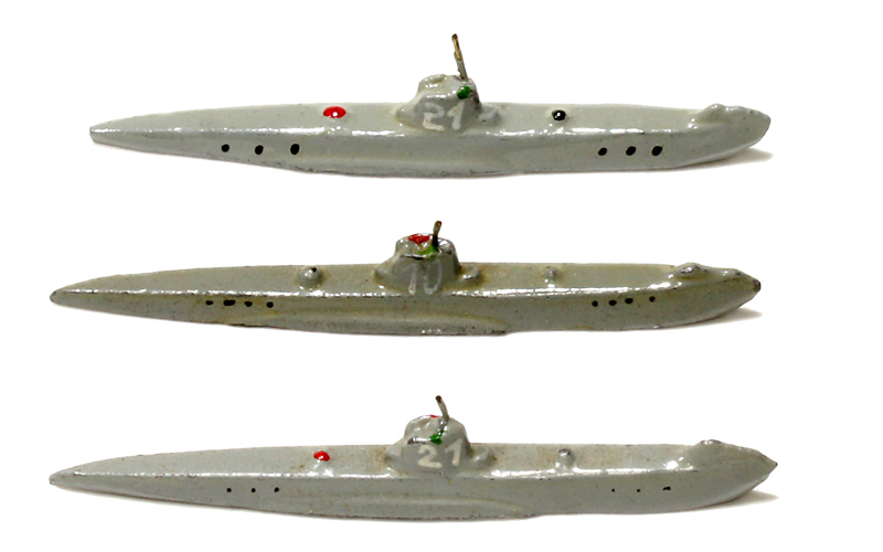 | 1936 - 1937 | VG, Metall, grau. Netzsäge, auf dem Vordeck eine gemalte runde Luke. Eine rechteckige Erhebung hinter dem Turm. 1 Drahtperiskop. Tauchtanklinie meist schwarz. An Heck und Bug je 4 bis zu 6 schwarze Punkte stellen die Flutschlitze dar. Turm weiss mit Kennung 1 bis 24 hds schwarz, Turm grau mit Kennung hds weiss. Die Ladeluke als offener Kreis wird bislang nicht erwähnt. Das Periskop sieht "konisch" aus, ist es aber nicht. Der relativ dicke Farbauftrag lässt diesen Eindruck entstehen. Grau bis sandgrau. Mit und ohne Tauchtanklinie, meistens 4 Flutschlitze, aber auch mehr in unterschiedlichen Abständen. Beim weissen Turm mit schwarzer Kennung eine größere Ladeluke, beim grauen Turm mit weißer Kennung eine kleinere Ladeluke. Dieses Modell wurde auch zusammen mit dem Begleitschiff Saar H.059 ausgeliefert. Details siehe dort.