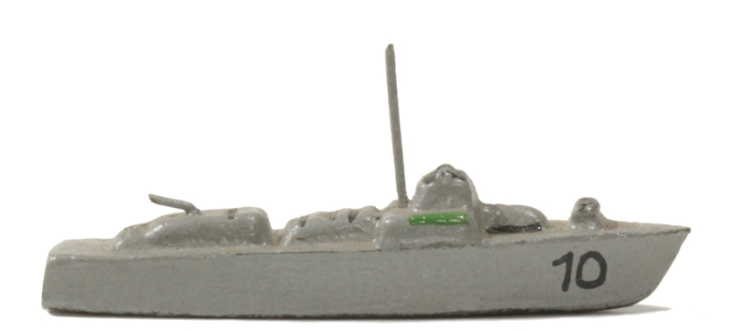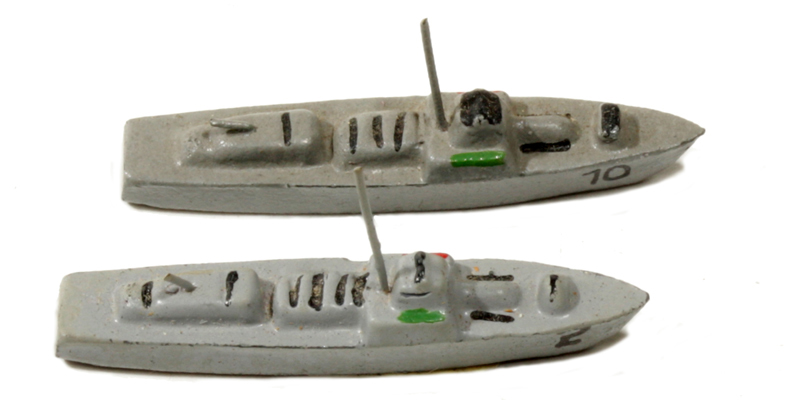 VG, Bodenstempel "RÄUMBOOTE", grau, Querluk auf dem Vordeck, hinter der Brücke quergeripptes Oberlicht. 1 Drahtmast, 1 Geschütz mit Drahtrohr. Kennung hds 1 - 24.
