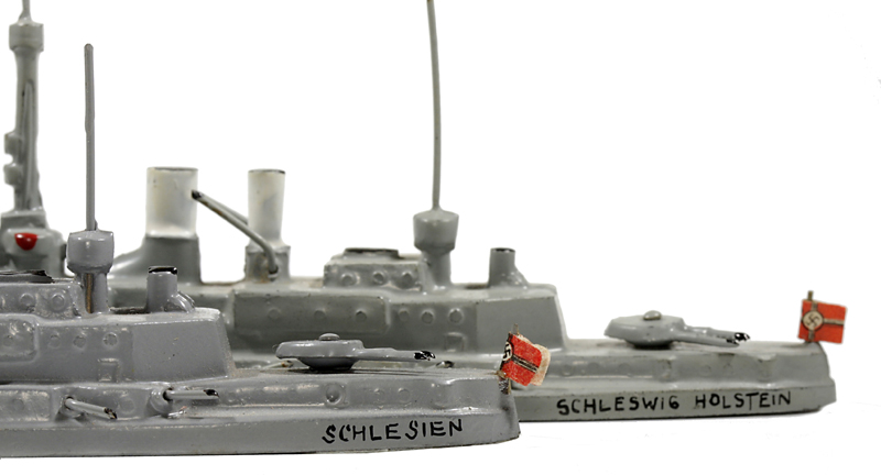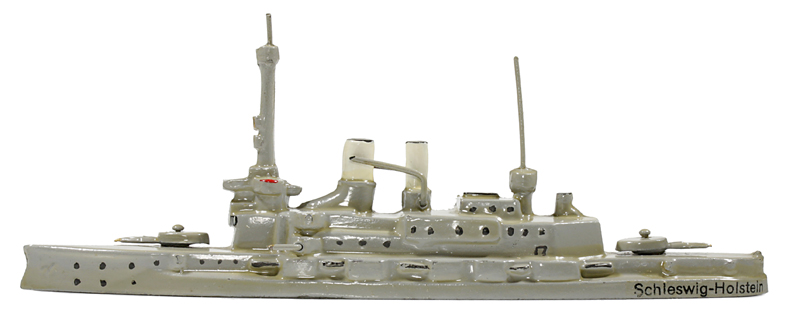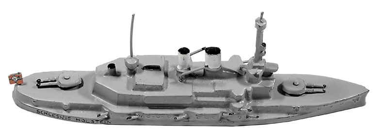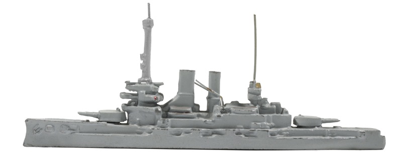 | 1932 - 1935 | Schieferguss, grau, Schornsteine weiß, Geschütztürme genagelt, je 6 Draht-Kasemattgeschütze beidseitig aus durchgezogenen Drähten, Gefechtsmast mit Drahtspitze, 1 Drahtmast, 2 Drahtkräne, gegossene Bullaugen, Flaggstock, Kennung hds |