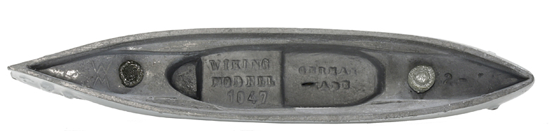 | 1938 - 1940 | HG, BP " grau, sandgrau, WM/ WIKING MODELL/ 1047/ GERMAN MADE/ 2,-", überarbeitete Form mit mehr Details, Schornsteine vertieft, Geschütztürme aus Metall mit Kuppel, Drahtkräne, E-Messer aus Draht querstehend, Kennung AZB |