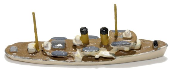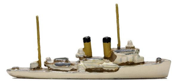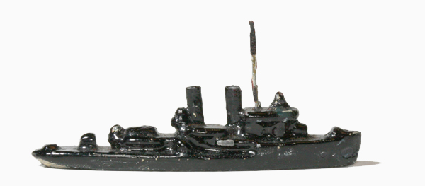 2 Schornsteine, 1 Drahtmast, Geschütze ohne Rohre. Heckgeschütz