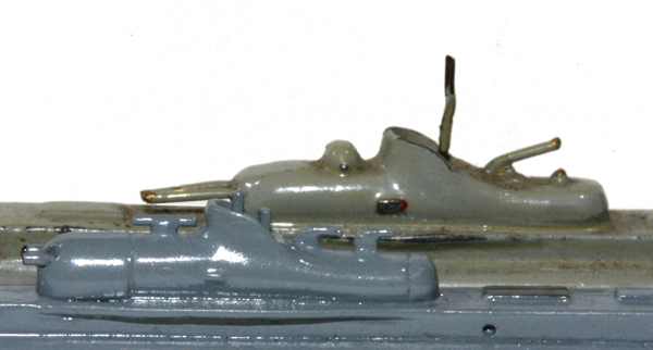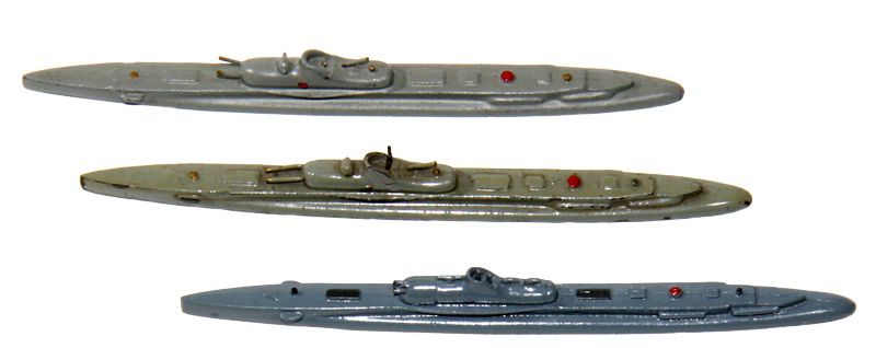 | 1938 - 1940 | VG, Metall, Bodenstempel "FRANZ.U-BOOT SURCOUF -,60", grau bis sandgrau, Farben matt oder glänzend, 2 Drahtgeschütze nach vorn zeigend, 1 Drahtgeschütz im sog. "Wintergarten" nach hinten zeigend, 1 Drahtperiskop, 1 rote Telefonboje, auch andere farbliche Details. Gewicht 18 Gramm |